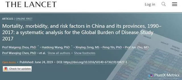 由中国疾病预防控制中心与美国华盛顿大学健康测量及评价研究所(IHME)合作完成,2019年6月发表在国际权威医学杂志《柳叶刀》的一篇论文显示:2017年中国人的十大死亡原因,分别是:中风、缺血性心脏病、呼吸系统 (气管、支气管、肺) 癌症、慢性阻塞性肺病、肝癌、道路交通伤害、胃癌、阿尔兹海默症及其它痴呆症、新生儿疾病和高血压性心脏病。