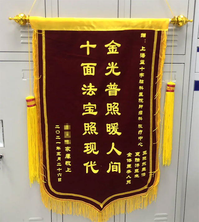 治疗过程中,王晓东团队坚持每日查房,密切关注患者病情变化。整个放疗过程结束后,患者恢复良好,左侧颈部肿大淋巴结基本消失。在办理出院当天,王晓东主任不忘反复叮嘱患者出院注意事项及复査时间,以及后续治疗方案。对于医院专业细致的服务,患者和家属非常感动,出院时为王晓东团队送上锦旗表达真挚的感谢。