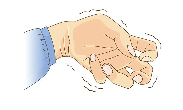 帕金森病的震颤大多数从一个手或脚开始,尤其手的震颤最常见,多数静止性震颤,即放松、静止不动时震颤,活动、用力时消失。手的震颤典型地表现为“搓药丸样”或“数钞票样震颤”,走路时容易发现。早期一般无头、下颌、嘴唇、舌头的震颤。除了震颤之外,患者常有肢体僵硬、动作不灵活等症状,医生检查也可发现肌张力增高等。