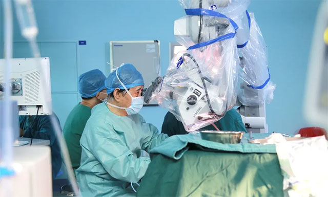 在明确告知手术风险并获得患者家属同意后,沈建康团队为患者开展了三叉神经微血管减压手术。术中,通过蔡司显微镜(双荧光),沈教授小心翼翼进行了手术。历时3个多小时的手术后,患者生命体征平稳,被安全送回病房。