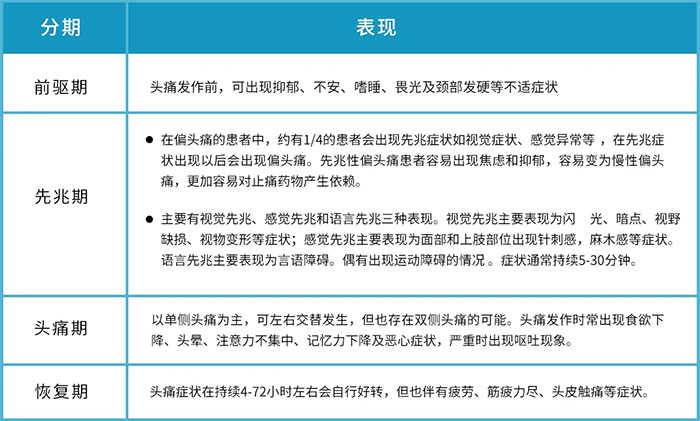 值得注意的是,偏头痛发作可分为四个阶段:前驱期、先兆期、头痛期和恢复期,但并非所有患者均经历这些阶段。