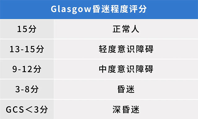 在昏迷患者脑功能专业评价方法中,应用比较广泛和重要的是格拉斯哥昏迷评分(GCS)和视频脑电图监测这两种方法。其中格拉斯哥评分(GCS),是国际通用的客观评价脑功能障碍和昏迷严重程度及预后的一种方法, 主要包括睁眼反应、运动反应和语言反应 3 个部分,总分最高 15 分,最低 3 分,其中 13~15 分为轻型,9~12 分为中型,3~8分为重型,GCS< 3 分表示预后不良,患者GCS昏迷评分越低,则意识障碍越重,预后越差。