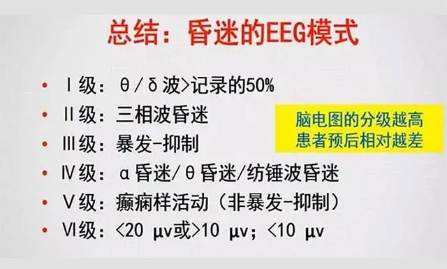 脑电图 (EEG) 监测方法,能够直接反映昏迷患者脑部皮层功能,对患者脑功能受损的严重程度及病情进展更为敏感,有助于判断临床预后,脑电图的分级越高,提示患者预后相对越差。为昏迷患者的病情评估和治疗方案选择提供了参考依据,有利于医生对阶段性治疗效果进行评价,及时调整优化治疗方案,对昏迷患者的促醒具有重要意义。