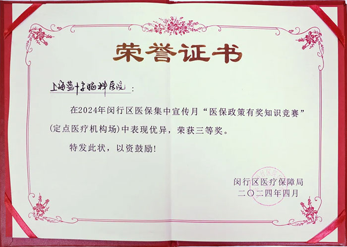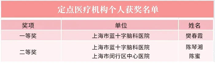 上海蓝十字脑科医院由张珍珍、张雨萌、杨琴琴组队出战,在决赛中获得定点医疗机构三等奖;财务科樊春霞科长、医保办陈琴湘科长则分获定点医疗机构个人一、二等奖。