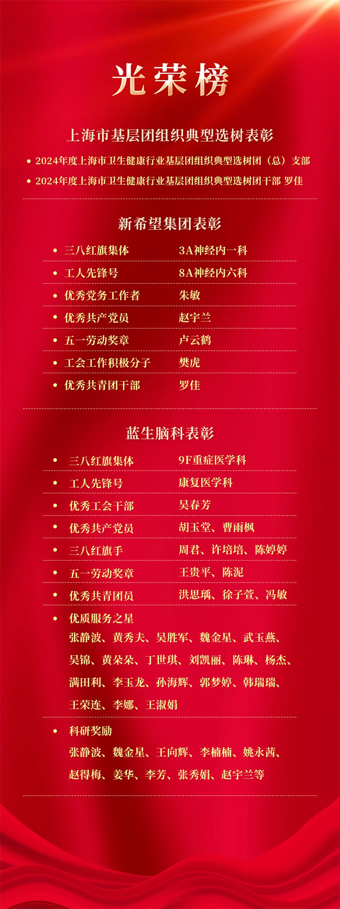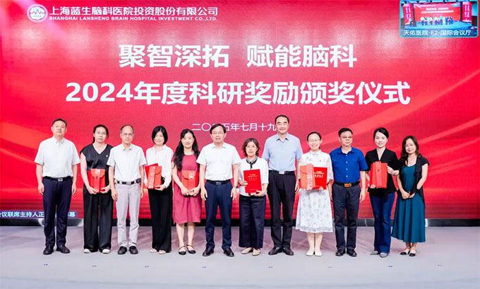 会上传来喜讯,上海蓝十字脑科医院荣获蓝生脑科“五一劳动奖状”。书记朱敏、工会主席吴春芳等17人和3A神经内一科、9F重症医学科等4个科室荣获新希望集团、蓝生脑科“两优一先”“工青妇先进”表彰。7A神经内三科主任张静波、7B神经内五科主任吴胜军等19人被评为蓝生脑科2025年上半年“优质服务之星”;6A神经外一科医生魏金星、中医科副主任赵宇兰等11人荣获科研奖励。蓝生脑科董事长卓立强、总经理刘轶永等领导为他们颁奖。