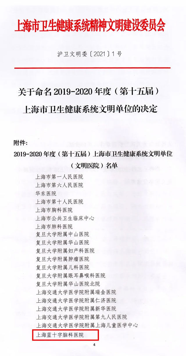 8月4日,上海市卫健委精神文明办公室公布“2019-2020年度(第十五届)上海市卫生健康系统文明单位”名单,上海蓝十字脑科医院榜上有名,再度荣获“上海市卫生健康系统文明单位”荣誉称号。上海市卫生健康系统文明单位是由中共上海市卫生健康委员会党组、上海市卫生健康委员会命名表彰的,是上海市卫生健康行业发展综合性成果的最高荣誉称号。