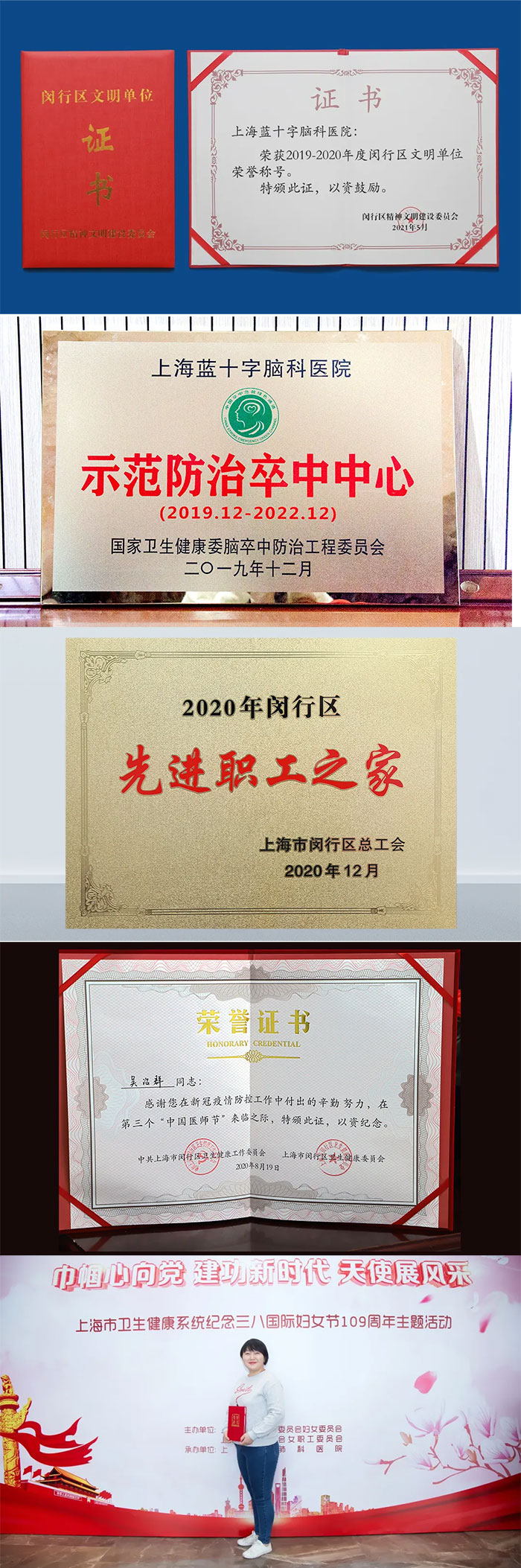 这些年来,医院获得国家卫健委脑防委“示范防治卒中中心”、上海市卫生健康系统文明单位、“信用评价AAA级、能力评价五星”医院、首批上海市“创新医疗服务品牌”、“上海市和谐劳动关系达标企业”等荣誉;党支部获得“七宝镇‘十佳’优秀党组织”、四星级党组织;工会获得闵行区 “先进职工之家”;神经内科荣获 “2019-2020年度上海市卫生健康行业青年文明号” ,神经内科7A病区护士长李楠楠荣获上海市卫生健康系统“三八红旗手”,神经外科6B病区留德博士吴治群荣获闵行区“防控疫情优秀医师”等荣誉。