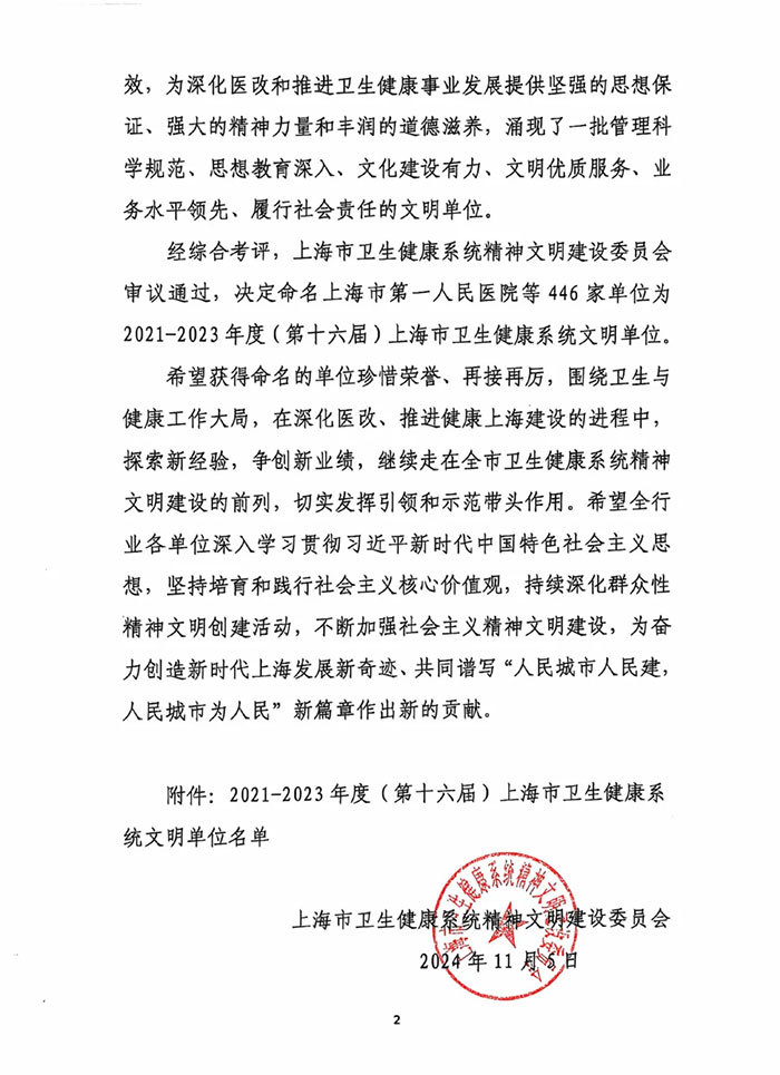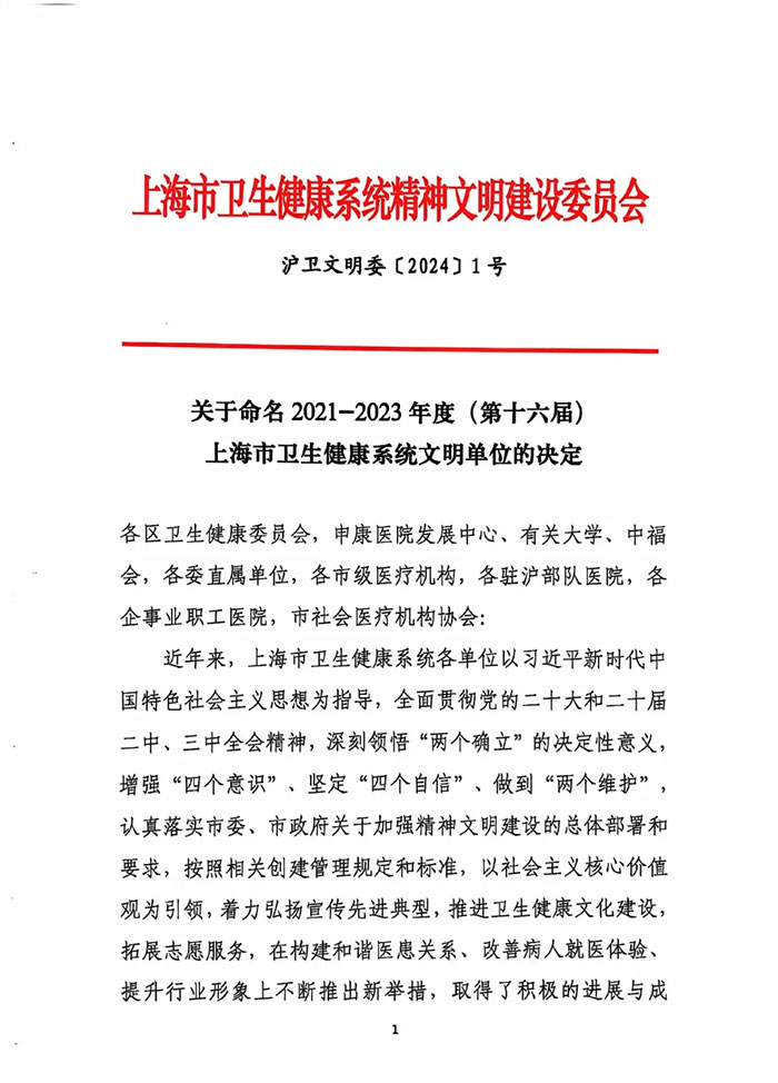 文明花开,捷报频传。近日,上海市卫生健康系统精神文明建设委员会办公室公布了“2021-2023年度(第十六届)上海市卫生健康系统文明单位”名单,上海蓝十字脑科医院成功入选,这是医院自2019年以来,连续三届获得该殊荣。此前,医院已连续四届获得闵行区文明单位。