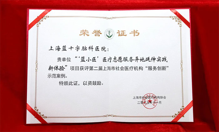 2025年11月27日,上海市社会医疗机构协会四届三次会员代表大会暨第十二届管理年会隆重召开。会上,在第二届上海市社会医疗机构 “服务创新” 优秀案例征集活动中,上海蓝十字脑科医院“‘蓝小医’医疗志愿服务异地延伸实践新体验”项目荣获第二届上海市社会医疗机构“服务创新”示范案例。