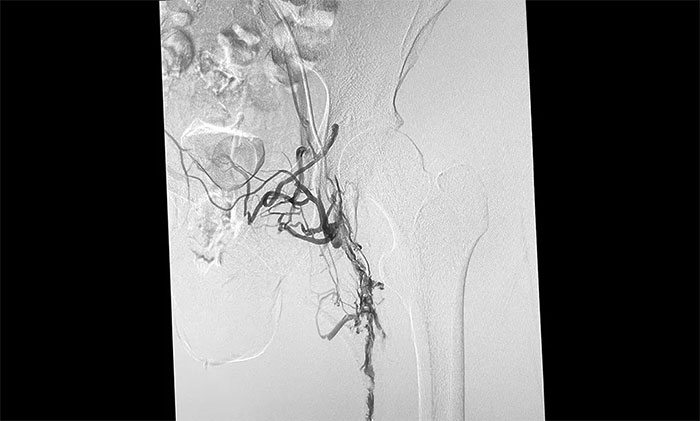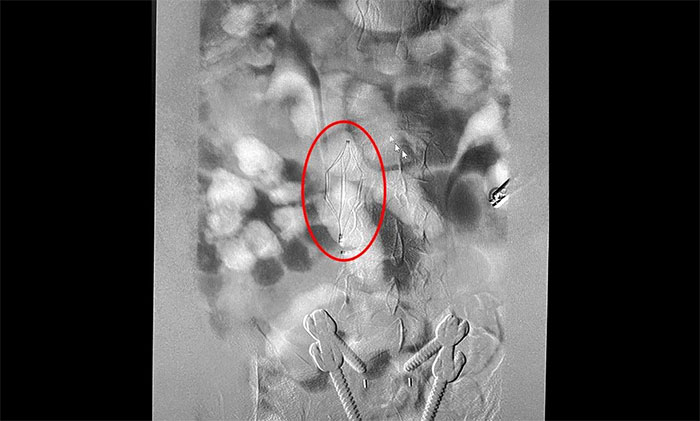 12月15日,席刚明教授在王贵平博士及介入团队协助下顺利行将一个形似伞状的人工滤器经患者右侧股静脉穿刺迅速置入肾静脉下方,“网”住了通往心血管和肺部的致命栓子,阻挡血液栓子进入肺动脉,及时挽救了患者生命。之后对病变血管进行了血栓抽吸术,及接触性溶栓,抽出了大量血栓,复查下肢造影示血栓基本消失,下肢静脉血管再通,整个手术顺利完成。术后,患者下肢肿胀好转。
