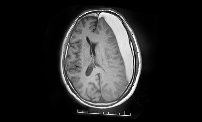 ▲ 左侧额颞顶部及右侧额部慢性硬膜下血肿,并挤压脑组织导致中线右偏
