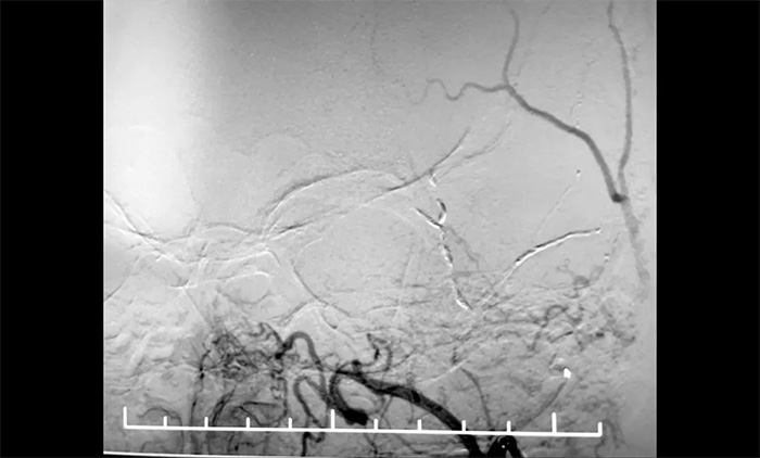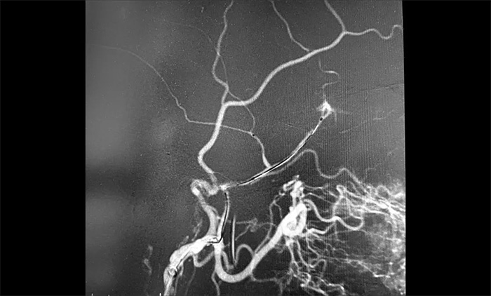 12月29日,顺利进行手术。术中,王贵平博士在介入团队协助下克服血管迂曲的困难,导管精准到达左脑膜中动脉前支、左脑膜中动脉后支,之后缓慢注入液体栓塞剂,栓塞剂逐渐向脑膜中动脉主干反流,复查造影,左脑膜中动脉无明显前向血流,手术成功。术后,患者无新发神经功能缺损。言语不清,肢体活动不利,头晕等症状逐步好转。