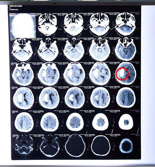 病人术前颅脑CT影像资料,红圈内白色阴影区为出血部位