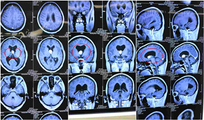 患者于2016年9月,在安静状态下无明显诱因,出现头晕头胀,后自行缓解;12月份患者在无明显诱因下出现精神狂躁,情绪激动,神志恍惚,头部CT示:两侧侧脑室前角及第三脑室前部区域占位,伴渗出,幕上脑室积水。曾于多家知名医院寻求手术治疗未果,2017年1月13日慕名来到上海蓝十字脑科医院,门诊以“颅内占位,脑积水”收住入院。