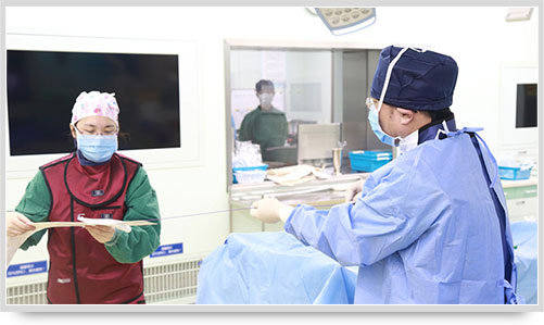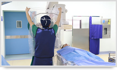 碘伏消毒、盖无菌罩、铺无菌单、穿手术服......一系列手术准备工作看似简单,每一个细节都要求精细化。由于介入手术室是在X线引导下进行造影检查和治疗的特殊场所,身体易受到超剂量X线辐射,整个手术过程,医生和护士都需要穿上30多斤重的铅衣。