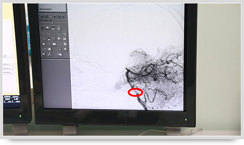 45岁的朱姓患者因“多发性腔性脑梗塞”头晕不明,接受了全脑血管造影术,术中显示他的颅内椎动脉血管痉挛(红圈内为病变部位)。据李主任介绍,以前像脑梗塞等脑血管疾病只能被定位到脑的功能区域,无法确定责任血管,而实施全脑血管造影术就能精准地找出病变血管,好比揪出了造成脑梗塞的“祸首”,大大提高了脑血管疾病的诊治水平。