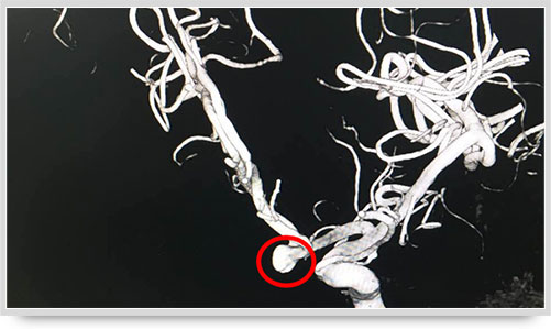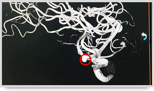 之前,另一位61岁的李姓脑出血患者,康复治疗半个月后复查,也接受了全脑血管造影术,术中显示大脑前动脉A1段动脉瘤(不同维度显影,红圈内为动脉瘤瘤体)。像这样的病人,必须进一步进行手术治疗,及早清除动脉瘤,避免因瘤体破裂造成再次出血危及生命。
