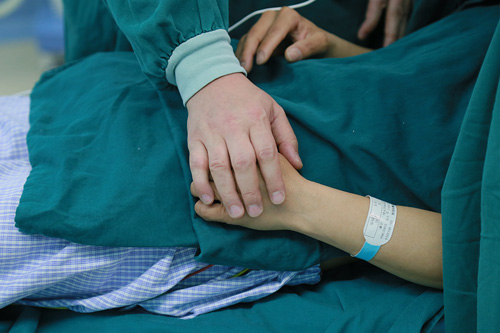 因为局部麻醉,整个手术过程,患者神志都非常清醒。一开始,霞姐情绪不稳定,一会说闷热,一会说身体酸疼,在手术台上动来动去。面对这种情况,巡回护士只得拉着患者的手,一会给她打开消毒单,让她透气,一会给她擦汗,并不停的安慰她。