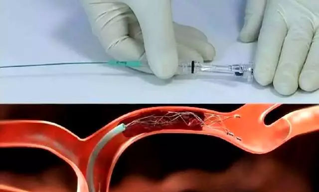 介入取栓是通过大腿2mm切口将取栓支架送进血管,到达血栓位置将血栓移除,从而实现血管再通。如果堵得不严重,就能用药物化开,可堵得非常严重,药物的效果就达不到了,所以必须把堵塞物去除才能恢复畅通。
