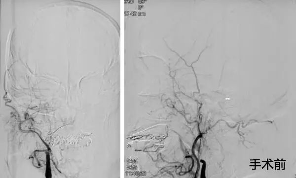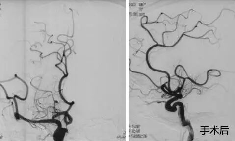 10:00am,患者被送入手术室,全麻下行全脑血管造影示:右侧颈内动脉处血流完全闭塞,血栓位于右侧颈内动脉T型分叉部,其他血管代偿不好,必须及时取栓干预。将微导管、微导丝送达血栓远瑞,微导管、微导丝到位后,成功释放支架,多次抽吸+支架拉栓,历时三个小时,取出大量血栓,患者血管达到2B级开通,血管恢复了供血。术后,转入九楼ICU。目前患者状态平稳,正在康复中。