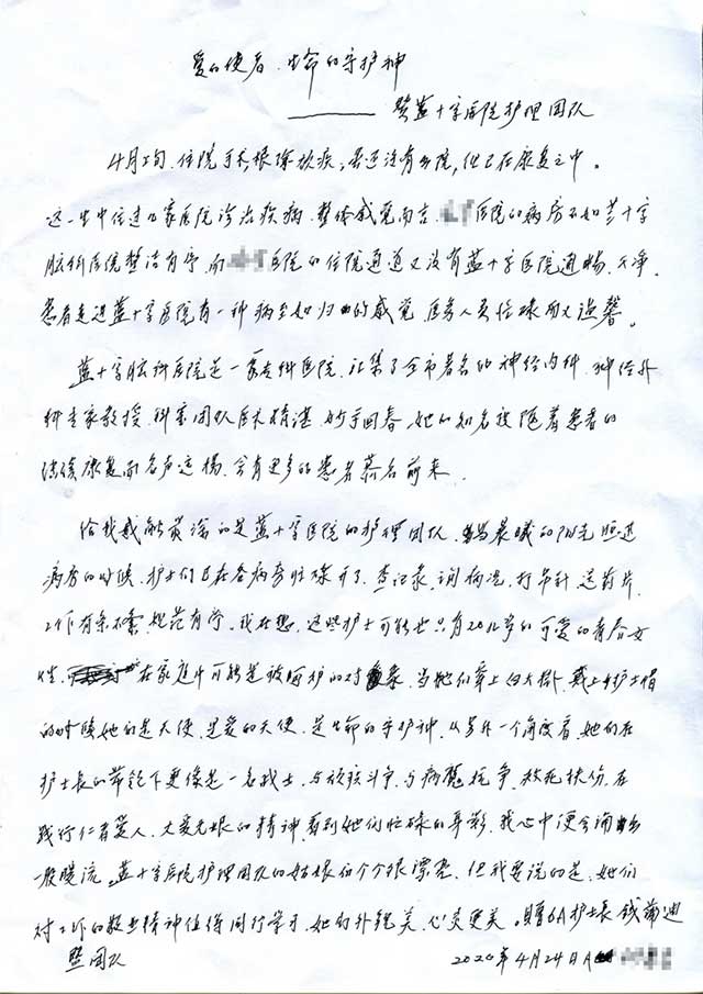 在出院前,患者亲笔写下题为《爱的使者 生命的守护神》的感谢信,高度评价医院神经外科(功能神外)6A病区以沈建康教授领衔的医生团队的技术实力,还特别感激护士们提供的优质护理服务。