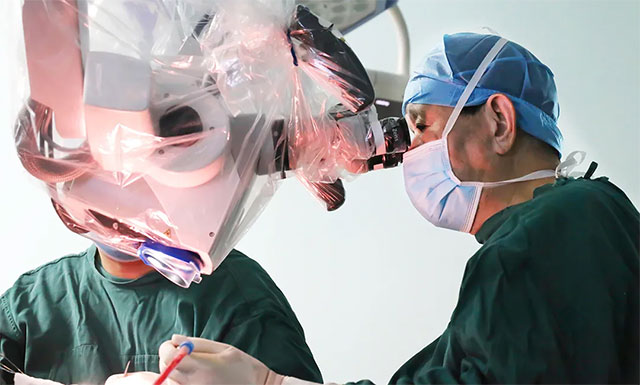 ▲借助蔡司显微镜(双荧光),沈教授进行手术