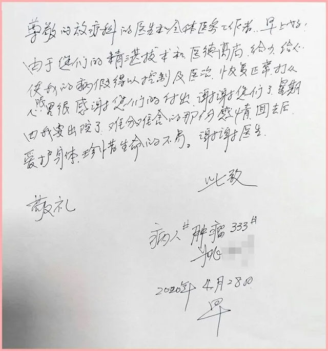“由于您们的精湛技术和医德高尚,给力、给心,使我的病情得以控制及医治,恢复正常,打心眼里很感谢您们的付出,谢谢您们了!星期四我就要出院了,难分难舍的那份感情,回去后,我会爱护身体,珍惜生命的不易……”