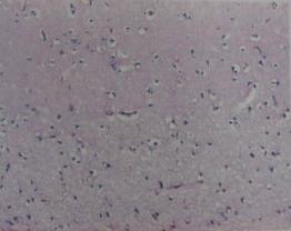 术后病理报告:大脑半球脑组织结构紊乱,神经元变性脱失,胶质细胞增生,见多量局灶性含铁血黄素沉着,局部皮层变薄,蛛网膜充血,纤维增生玻璃样变性,白质疏松水肿。海马神经细胞排列紊乱、变性、脱失,局灶出血,白质疏松水肿,蛛网膜充血,胶原纤维增生(图4)。