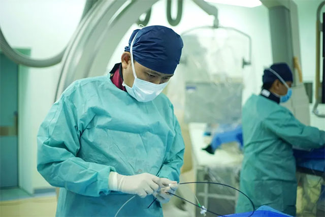 在征得家属同意后,6月12日,张琪博士团队为患者进行了下腔静脉滤器置入手术。张琪博士在医护团队协助下将一个形似伞状的人工滤器经患者右侧股静脉穿刺迅速置入下腔静脉,“网”住了通往心血管和肺部的致命栓子,阻挡血液栓子进入肺动脉,及时挽救了患者生命。