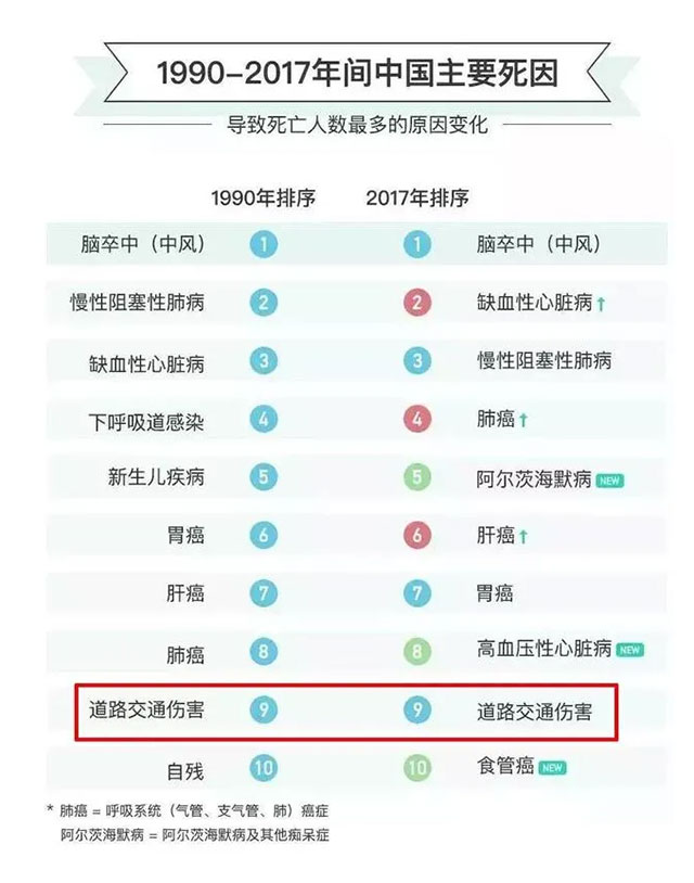 2019年6月25日,世界知名医学期刊《柳叶刀》(The Lancet) 发表了题为《1990-2017 年中国及其各省份死亡率、发病率和危险因素:2017 年全球疾病负担系统分析》的研究报告。“中国人死亡原因排名”道路交通伤害作为唯一非病因素入榜前十 。
