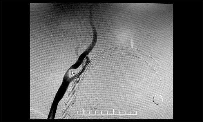 术后康复观察一月余,于耀宇主任团队再次为曹老伯行右侧颈动脉支架置入及左侧椎动脉支架置入手术。术中造影显示,右侧颈内动脉起始段重度狭窄,狭窄长度8mm左右。左侧椎动脉 V4 段重度狭窄,长度6mm左右。运用娴熟扎实的技术,在充分做好脑保护的前提下经过多次球囊扩张后,顺利释放支架于狭窄处。造影提示支架打开良好,血管狭窄基本恢复正常,支架贴壁佳,支架内血流通畅,远端血流良好。