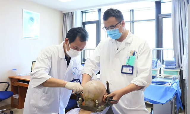 在亲戚的极力推荐下,许阿姨从遥远的西南边陲风尘仆仆来到上海蓝十字脑科医院,找到了医院功能神经外科刘伟钦主任。刘伟钦主任团队对患者的病情开展了严谨细致的检查评估。经过开展讨论后认为,患者初期服用抗帕金森病药物控制效果好,但疗效逐渐下降,增加剂量效果也不佳。病情呈不断加重趋势,已严重影响患者生活。在无明显手术禁忌症,患者和家属签字同意后,刘伟钦主任为许阿姨进行了脑深部核团立体定向手术治疗。
