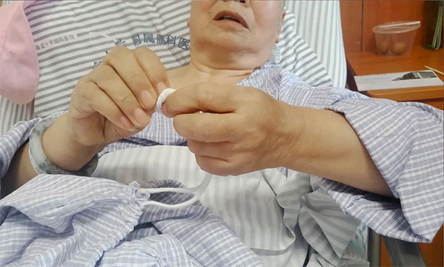 经过历时5天的术后恢复,许阿姨的左侧肢体抖动症状几乎完全消失,左手又变得灵巧起来,不仅能自行将细巧的松紧绳穿进裤腰洞眼,还能稳稳地将绳子打上一个牢固的活结——而这些精细的手部动作,在手术前她是无法完成的。“更让我开心的是,晚上睡觉感觉好多了,到现在都没做过噩梦,知道这里可以手术就应该早点来的!”许阿姨开心地表示,等她出院后,一定会将自己在蓝十字的治疗经历与其他“帕友”分享,让更多“帕友”得到更好的治疗,恢复正常生活。