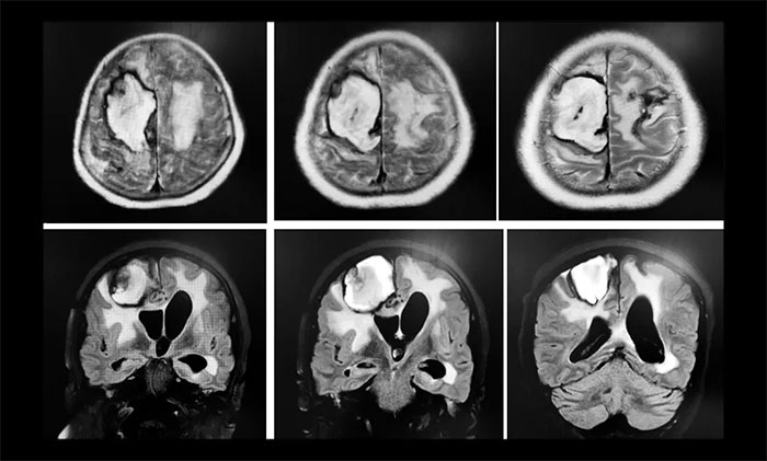 ▲ 入院时,行头颅MRI示:静脉窦血栓导致右侧额顶叶、基底节区及左侧额叶大面积出现脑积血、脑水肿