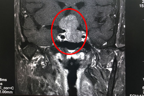 术前核磁共振显示:垂体巨大腺瘤(画圈部分)