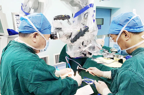 潘仁龙教授在德国蔡司双荧光显微镜的下进行精密手术