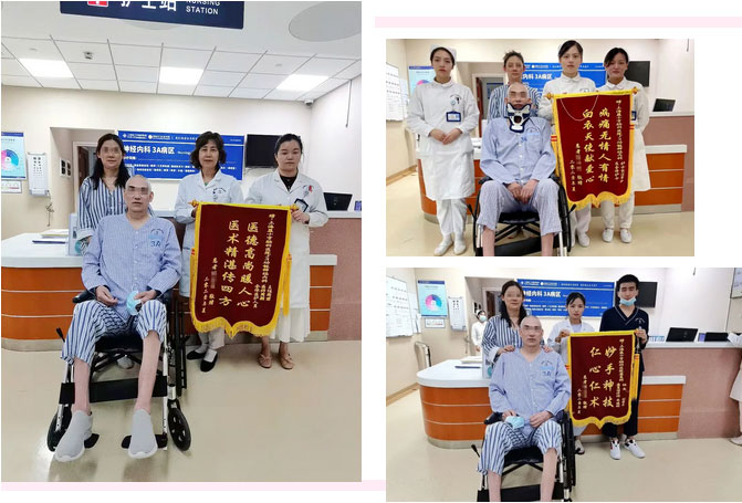 为了感谢神经内科3A病区医护、康复团队专业优质的服务,老刘夫妇特意定制了三面精美的锦旗,以表达最诚挚的谢意。“像我这样高大的瘫痪患者,照顾起来本就非常麻烦,这里的医护从来没有丝毫怨言,还时常讲笑话逗我开心,真正做到了不是亲人胜似亲人!”老刘动情地说道。