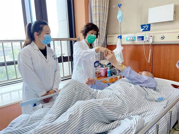 而优质的护理对于高位截瘫患者的康复也意义重大,由于患者行动不便、长期卧床,护士要时常关注保持患者呼吸道通畅、预防褥疮、预防泌尿系统感染等。汪亭如护士长带领的护理团队不怕苦、不怕累,对于老刘这样的“大个子”患者,一位护士“搞不定”就两个一起协力,尽心尽责做好瘫痪患者的护理。患者来院时留置导尿管排尿,通过科室医护的努力,患者于8月28日顺利拔除了导尿管。
