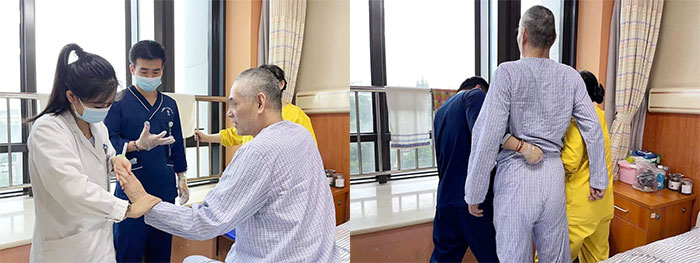 ▲ 康复师和护工一起协力为高大患者进行锻炼