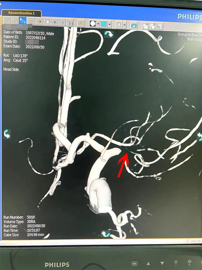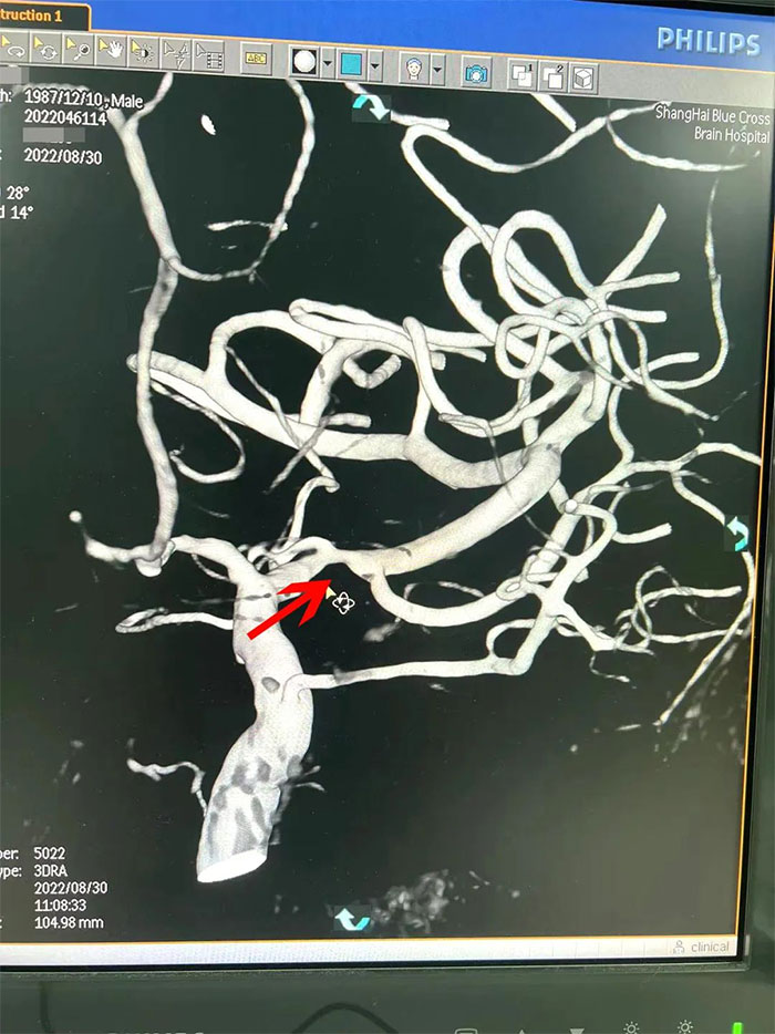 在检查中发现,周先生右侧大脑中动脉M1段闭塞,可见烟雾状异常血管网生成;左侧大脑中动脉M1段重度狭窄(约70%)。符合烟雾病的典型影像学特征。