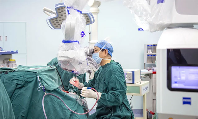 ▲ 沈教授通过蔡司显微镜(双荧光)进行手术