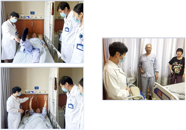 之后,患者陆续在医院治疗了三个多月,在戴秀珍主任和管床医生精心医治及护士暖心护理下,胡先生病情明显好转。其右上肢已完全消肿,可以举起,右上肢远端肢体肌力也从之前的0级恢复到现在的2级,仍需进一步恢复;而其右下肢恢复很好,现在不仅自己一次可以独自站立20分钟,还可以独自行走一小段路;言语功能明显改善,可以和家人及医护人员进行正常沟通和交流。