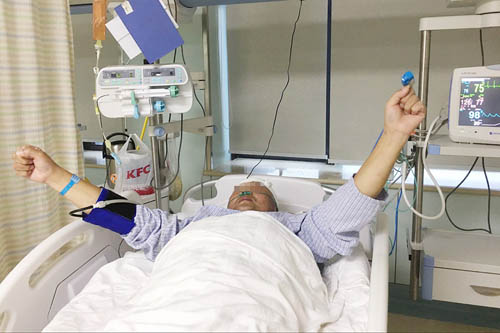 脑瘤手术后第2天,王先生举起双臂以显示他现在状况良好