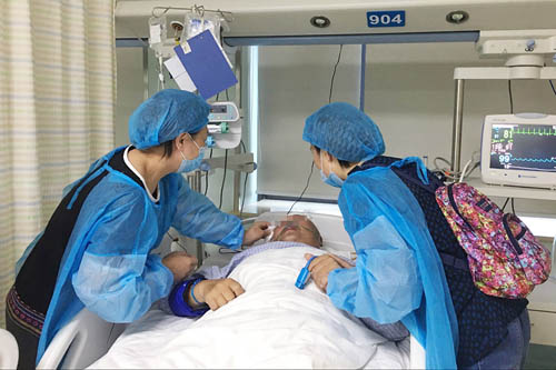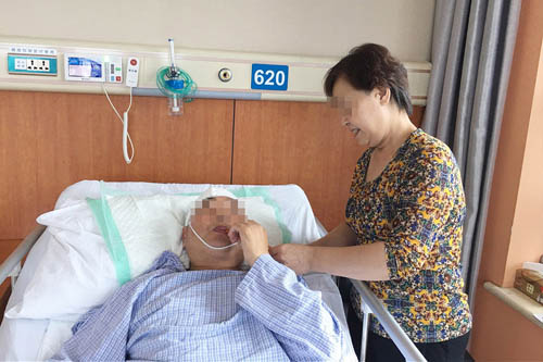 脑瘤手术后,在ICU(重症监护室),家属为王先生擦拭眼泪