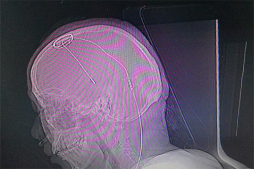 准备就绪后,医生利用磁共振(MR)结合立体定向设备为患者进行影像扫描,再利用手术计划系统进行数据计算,规划手术路径,确定手术的三维立体精准坐标。“电极的直径只有1毫米左右,对手术定位精准度要求非常高,哪怕一点误差都会影响治疗效果。”将手术坐标与患者头部定位支架核对确定后,刘伟钦主任及其团队在患者头部切开了一道切口,并在颅骨打孔,固定好电极基环,最后将电极缓缓植入大脑内丘脑底核处。