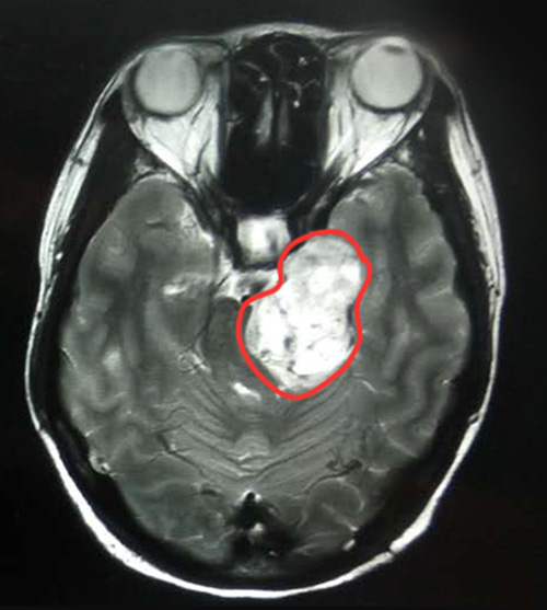 ▲MRI影像显示,左侧桥小脑角区有一4.8*3.3厘米的肿瘤