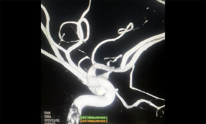 患者收治入院后,孔祥玉医生一边做好疾病科普宣教,一边安抚患者紧张恐慌的情绪。为尽快明确诊断和制定下一步治疗方案,在明确告知风险并获得患者同意后,由医院神经外科6A病区于耀宇主任为患者进行DSA脑血管造影检查。于主任介绍,颅内动脉瘤目前主要通过脑血管CTA、MRA和DSA等血管成像技术来发现,其中,三维脑血管造影(3D-DSA)是脑血管病精准诊断的“金标准”,可为医生判断动脉瘤所处位置、形态、大小等提供依据,常用于动脉瘤的最终确诊和介入治疗。