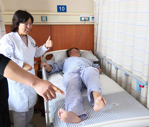 ▲经过半个月治疗,赵秋华左腿按照医生的指示可以活动自如