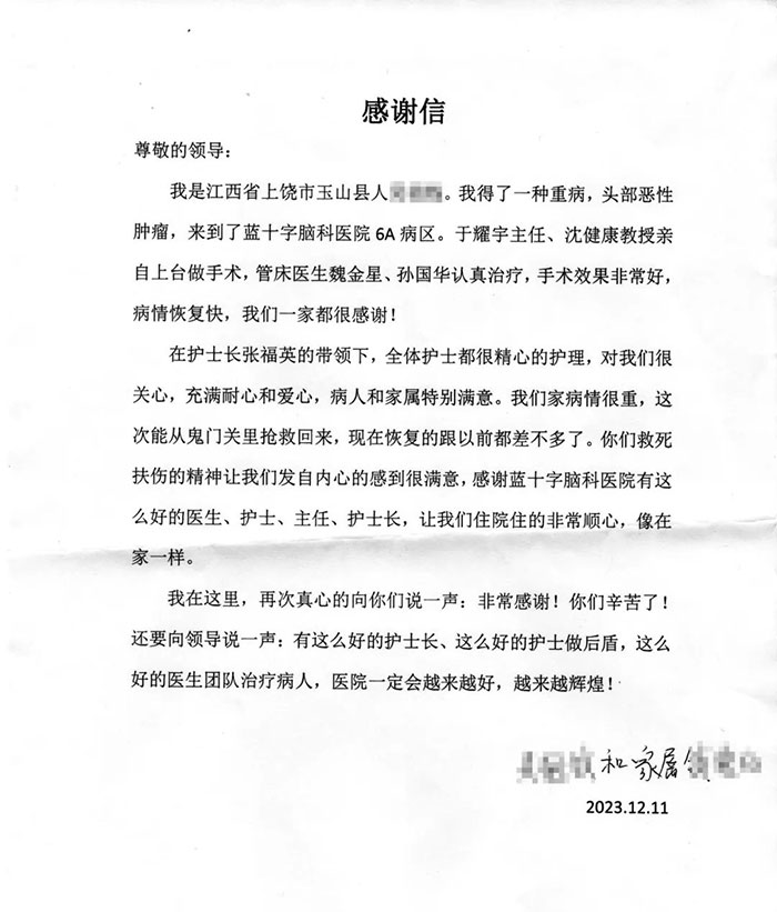 12月11日,即将出院的吴先生委托家属钱女士,为医院神经外科6A病区医护人员送上了一封饱含真情的感谢信。