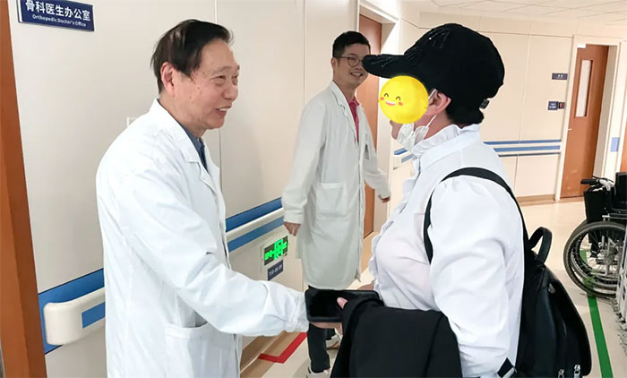 ▲ 一位脑出血患者经周教授诊断行保守治疗顺利康复,激动地握住周教授的手